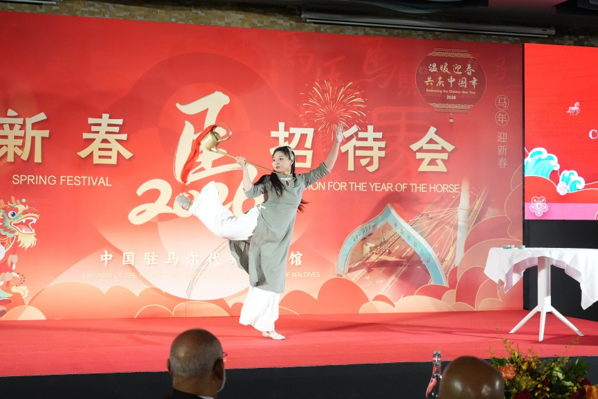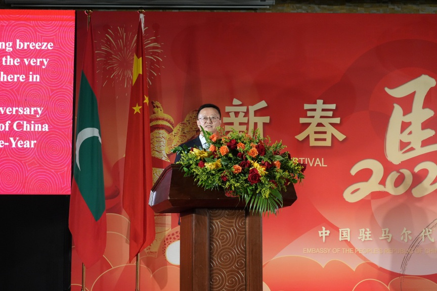 Chinese Ambassador to the Maldives Kong Xianhua speaking at the Chinese Embassy’s Spring Festival Reception celebrating the Year of the Horse, February 12, 2026. (Photo/Embassy of China)
