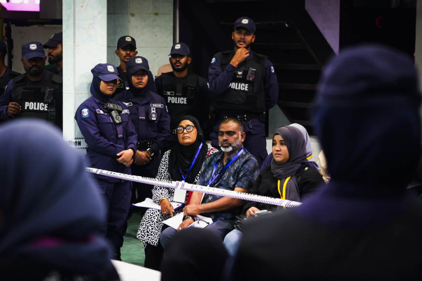 Counting for the Henveiru West constituency ballot box at Majeediyya School, which had been paused due to disputes during ballot counting in Saturday’s Local Council and Women’s Development Committee elections—as well as a referendum on merging the presidential and parliamentary elections—has now resumed under the supervision of police and Elections Commission (EC) officials.